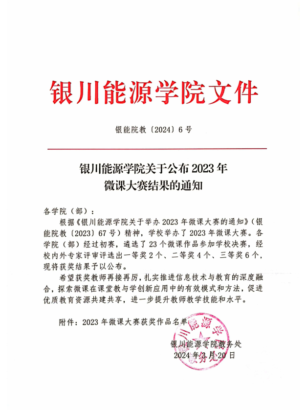 银川能源学院关于公布2023年微课大赛结果的通知