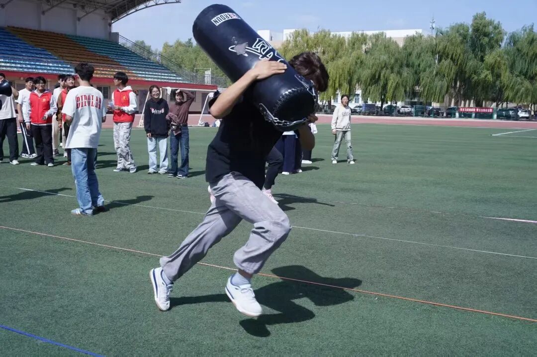 让我们将镜头转向负重接力的同学们,一场速度与耐力的考验 负重接力的赛道上,选手们像离弦的箭一样冲了出去。他们身上背着沉重的沙袋,却依然健步如飞。每一位选手都拼尽全力,将手中的接力棒传递给下一位队友。当接力棒交接的瞬间,那默契的配合让人赞叹不已。有的选手在奔跑过程中不小心脚步踉跄了一下,但马上又稳住了身形,继续向前冲。观众们的目光紧紧地跟随着选手们的身影,嘴里不停地为他们加油鼓劲。