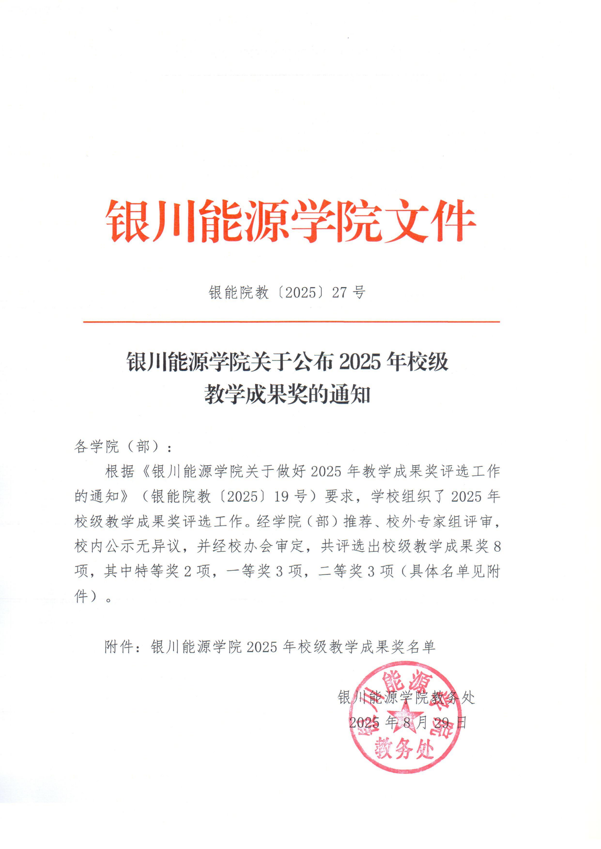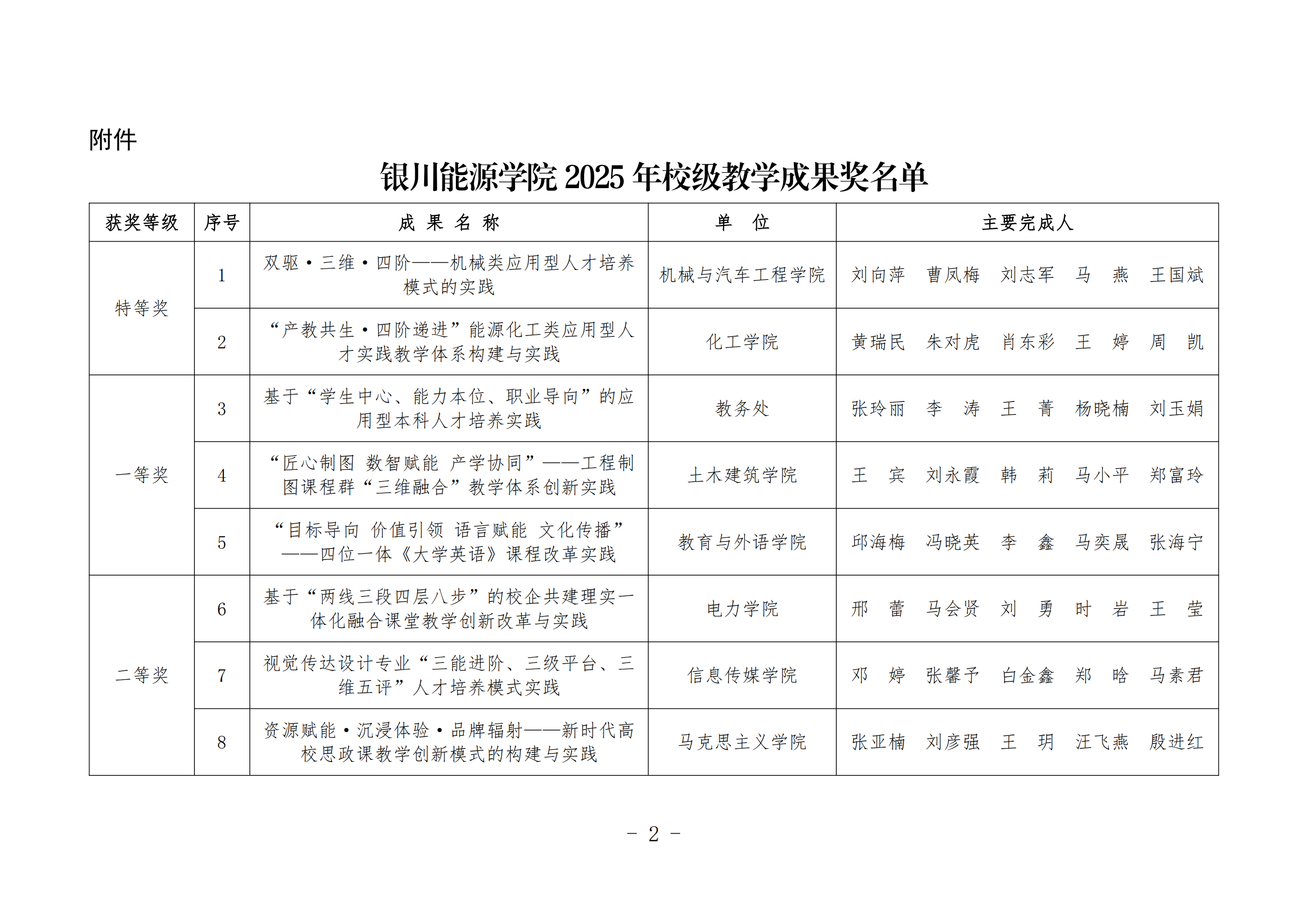银川能源学院关于公布2025年校级教学成果奖的通知