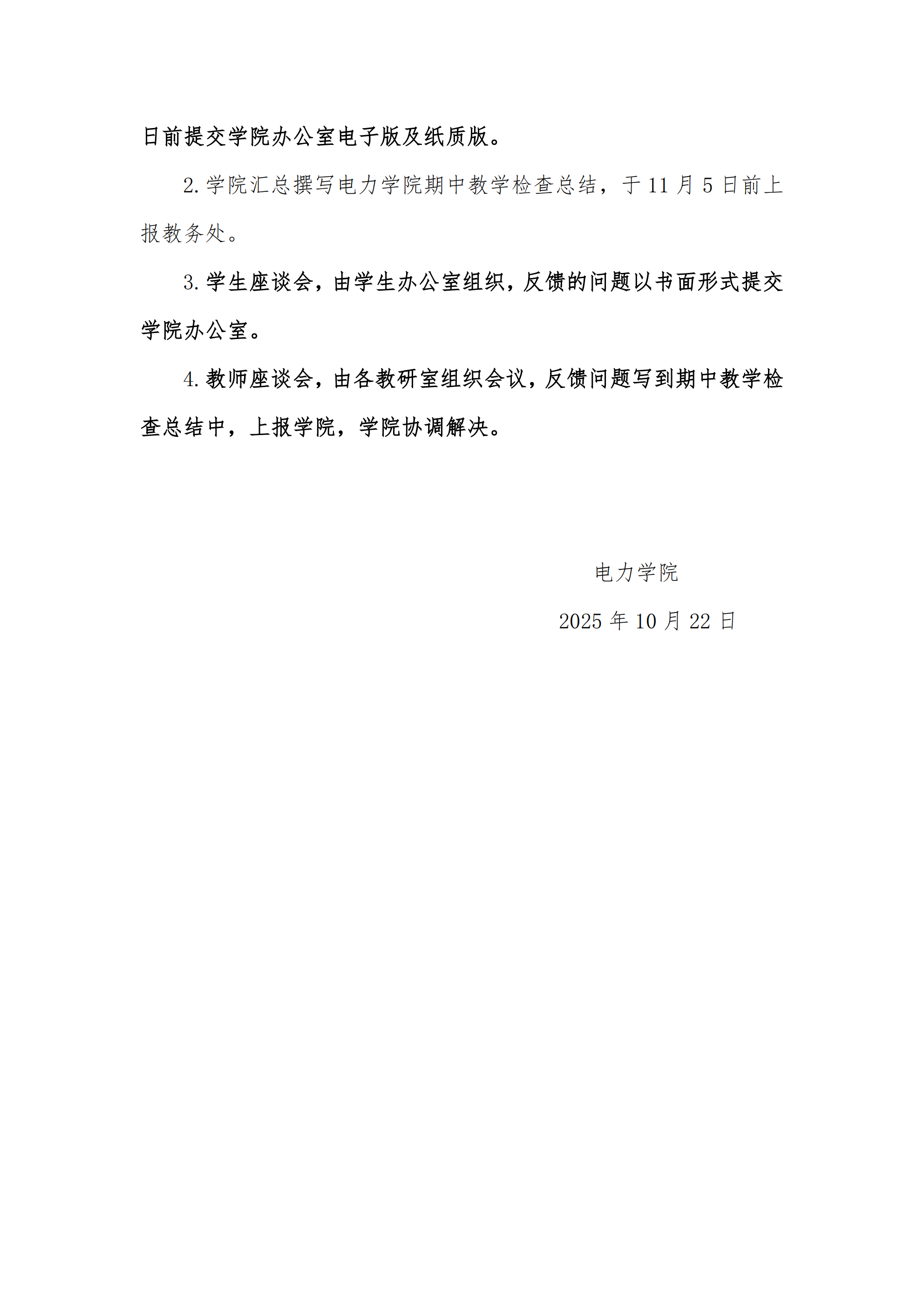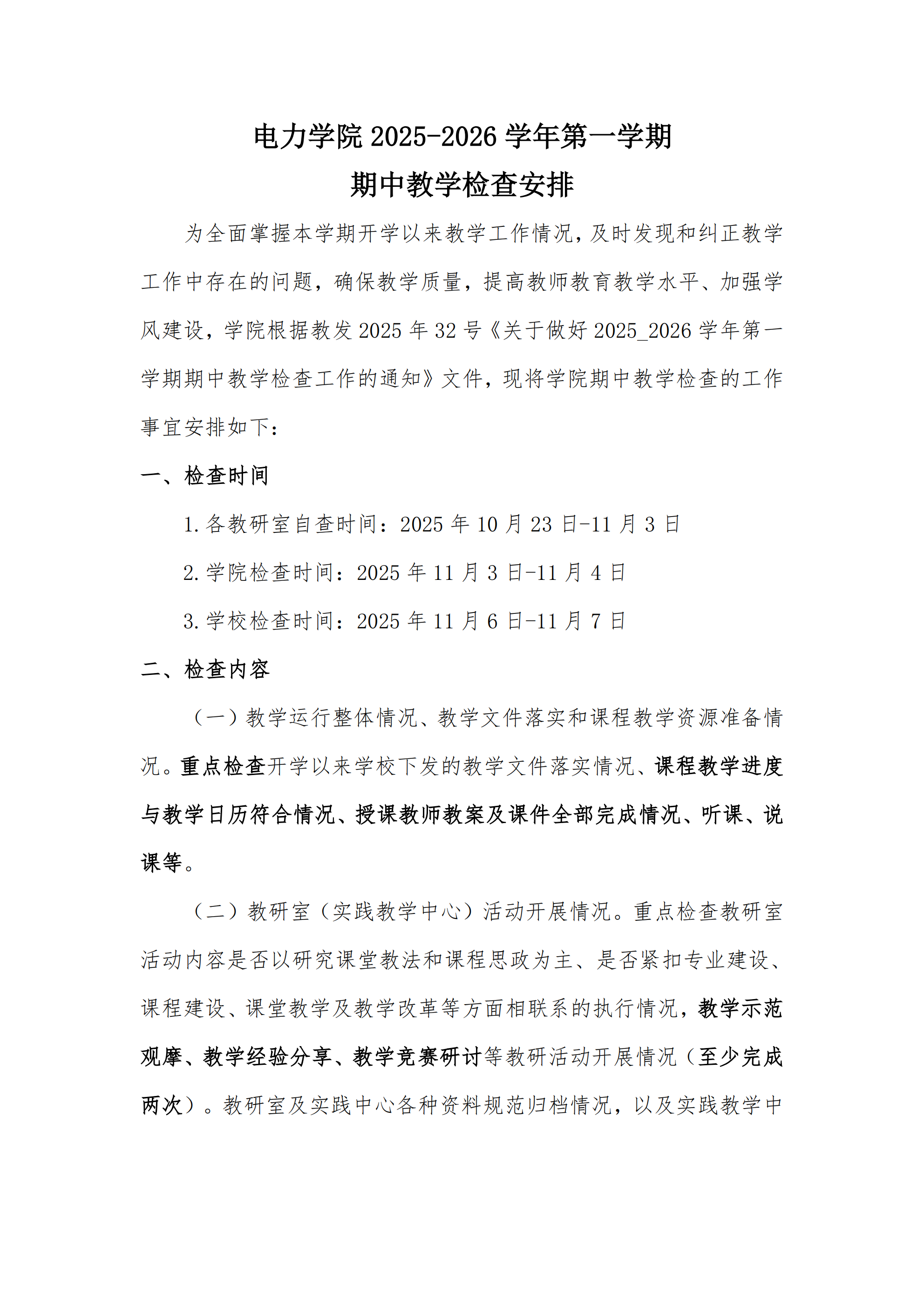 电力学院2025-2026学年第一学期期中教学检查安排