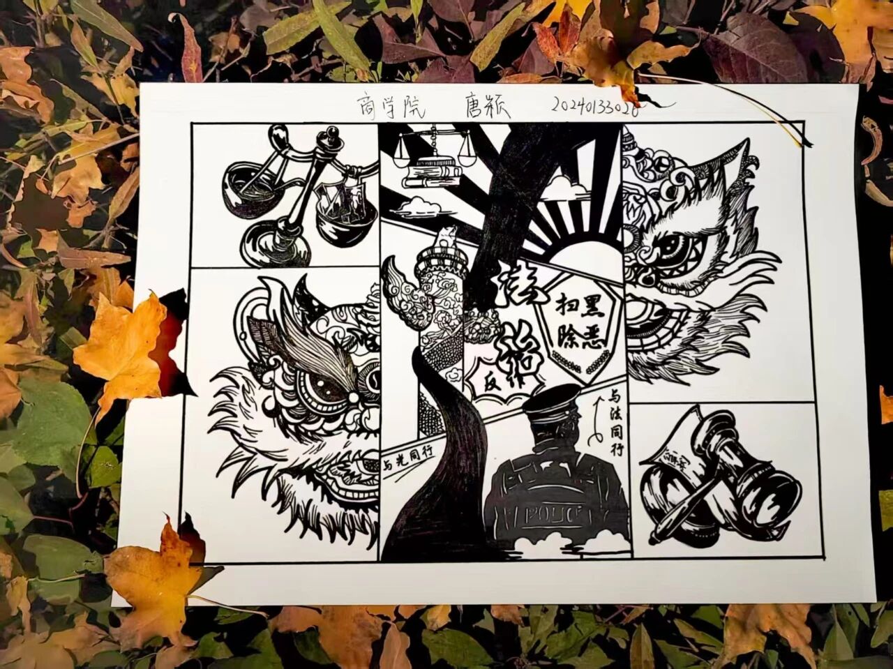 漫步校园,法治与艺术的碰撞无处不在。长廊转角、草坪展板上,一幅幅画作与秋景相映成趣:有的以红金为主色调勾勒宪法条文,凸显法律至高权威;有的用漫画形式还原扫黑除恶案例,传递正义力量;还有的将“知法守法”理念融入校园生活场景,满是青春气息。往来师生驻足观赏,在欣赏秋景的同时,也被画作里的法治内涵吸引,原本抽象的法律条文,变成了可看、可感的视觉符号。