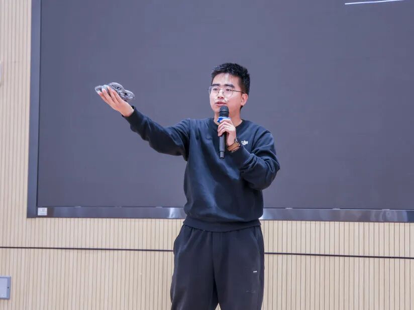 讲座环节干货满满。金鑫讲师率先开讲,从大疆创新的品牌实力切入,细致梳理了无人机在就业实践、毕业设计、日常娱乐等多元场景的应用价值。针对大家普遍关注的操作复杂、携带不便、价格偏高的痛点,他深入解析了无人机掌上起降、智能跟随、4K高清画质等便捷功能,更传递了无人机作为“科技平权工具、创意画笔与社交名片”的多重内涵。讲解尾声,讲师邀请同学们现场实操,在亲身体验中感受智能跟随的稳定流畅,用4K画质记录独特视角,真正解锁无人机摄影的乐趣与魅力。