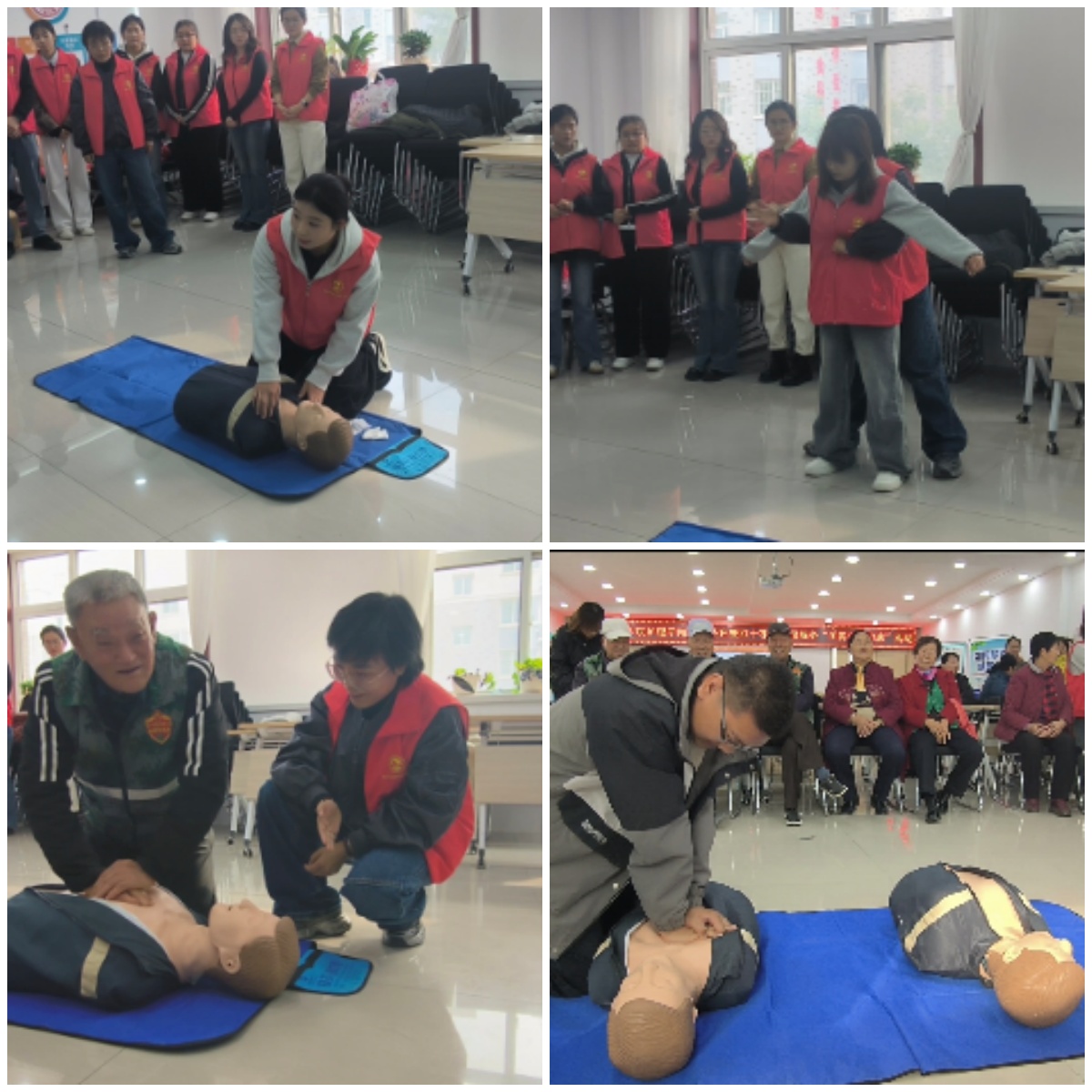 健康服务环节中,青年学生志愿者寇雨欣结合霜降后老年人常见健康问题,以通俗易懂的语言讲解“暖心过寒冬”冬季健康防护指南,从保暖穿搭、饮食调理到慢性病日常护理,细致解答老人提出的各类疑问,帮助老人们掌握科学过冬的实用知识。党员教师团队则聚焦应急救护技能普及,通过“理论讲解+现场演示+互动指导”的方式,向社区工作者及老人系统演示海姆立克急救法的操作要点、心肺复苏的标准流程与注意事项,还邀请社区工作者及在场老人近距离观察、模拟练习,确保大家在紧急情况下能准确运用急救技能。