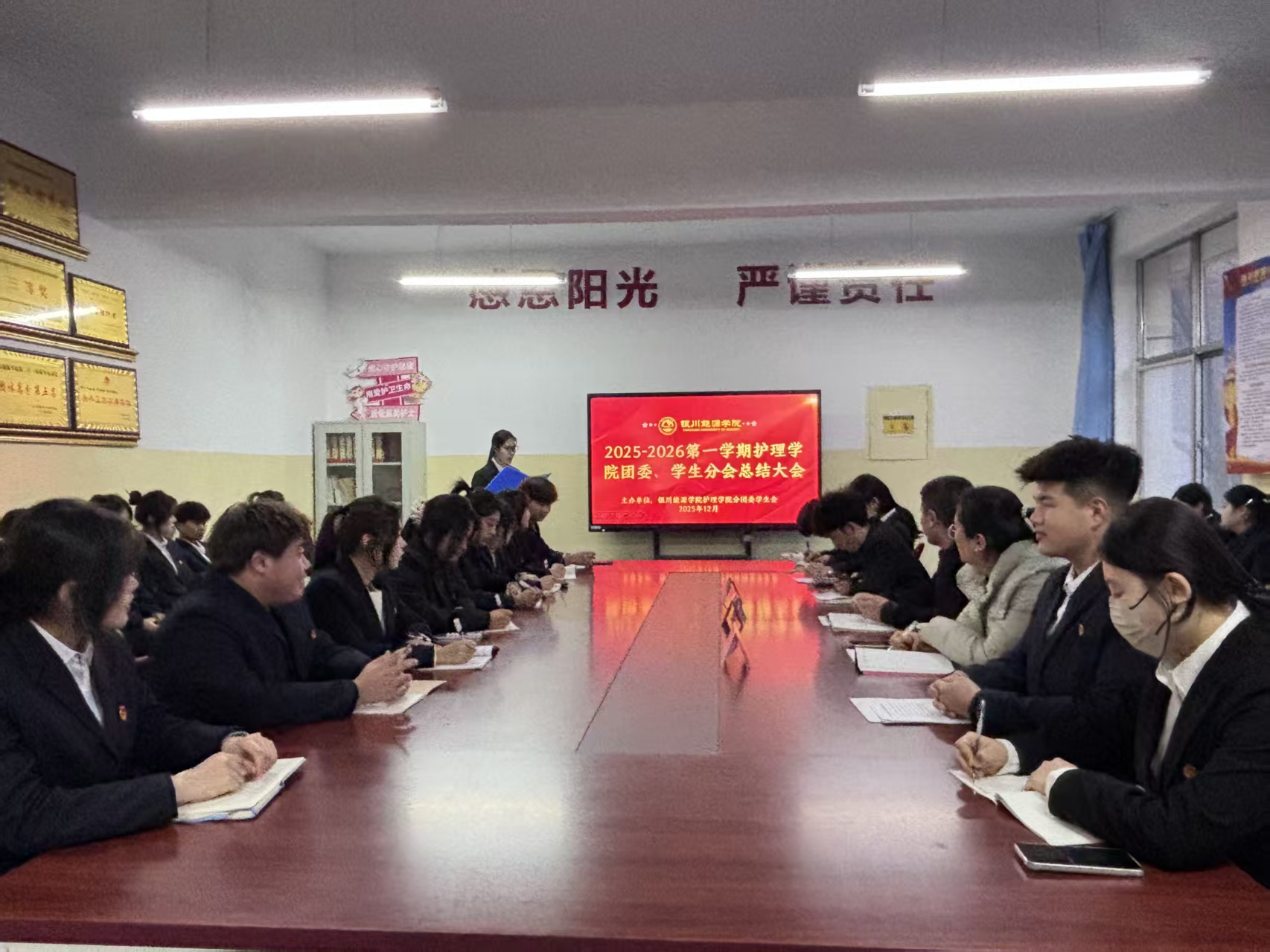 冬意渐浓,岁聿其莫。为系统复盘学期工作成效,表彰先进树立榜样,明确未来前行方向,近日,护理学院团委、学生分会2025-2026第一学期总结大会隆重召开。护理学院党支部副书记张佳楠、分团委书记陈刚、尤建宁等老师出席会议,团委及学生分会全体成员、各班级学生代表参会,大会由马蓉同学主持。
