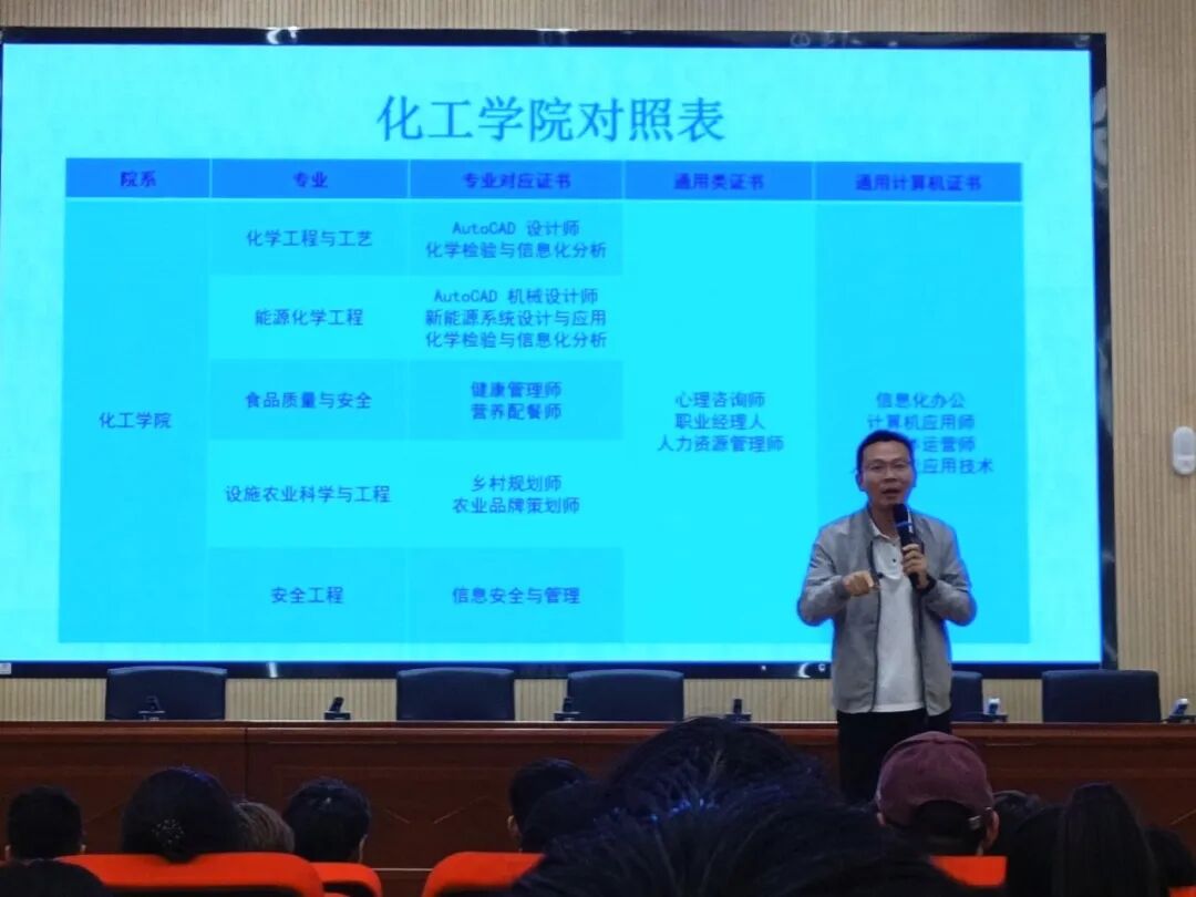 为帮助学生明确职业发展方向,提升就业竞争力,10月15日晚,化工学院组织各年级学生在国际教育中心报告厅参加大学生职业生涯规划与职业技能证书宣讲会。