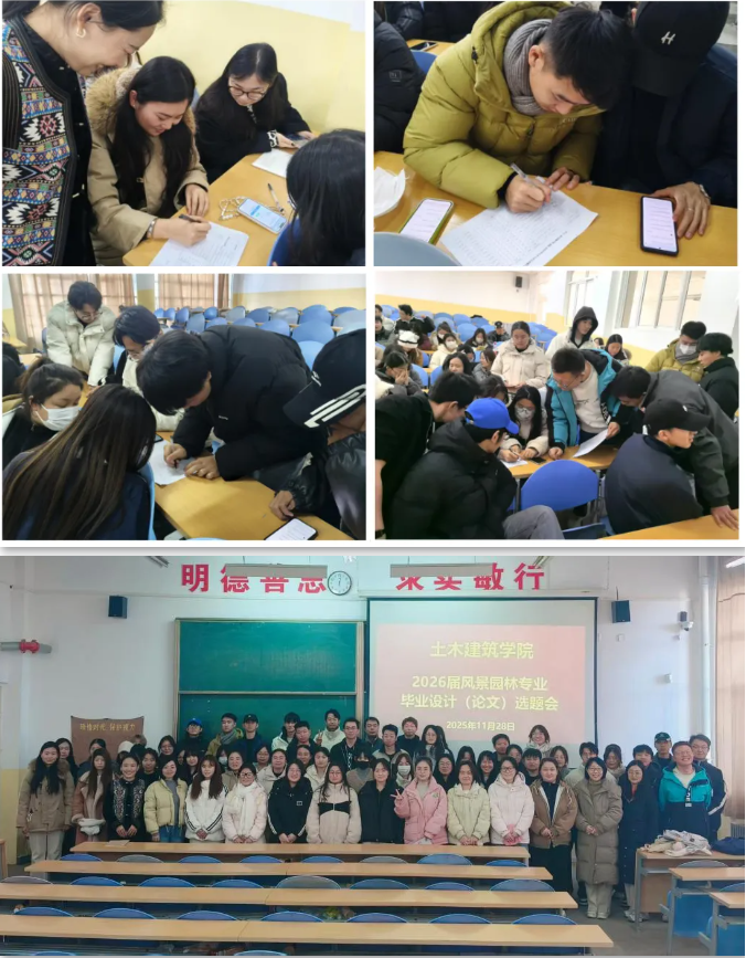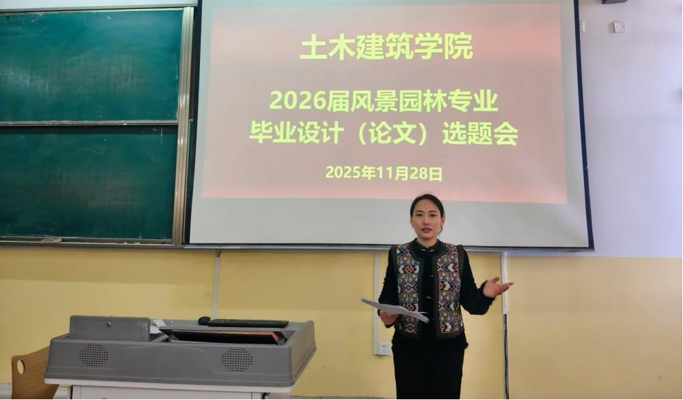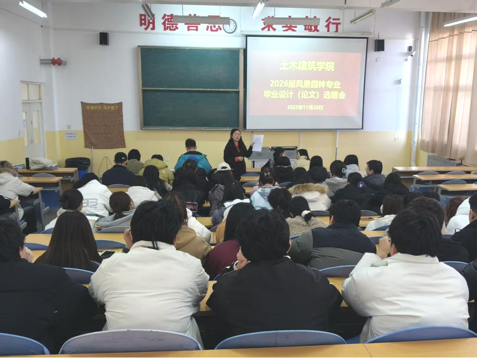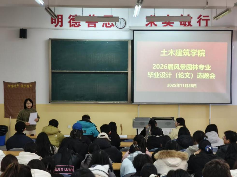 为落实学校应用型人才培养目标,规范毕业设计全过程管理,土木建筑学院风景园林教研室于近日组织召开了2026届毕业设计(论文)选题大会。专业带头人刘丹老师、教研室主任杨小英老师、全体专业教师及毕业生参加会议。