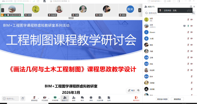 本次研讨交流会聚焦《工程制图》课程教学改革与课程思政建设。虚拟教研室负责人结合课程设计、教学实施、育人成效等方面,分享了工程制图课程思政教学的实践经验。