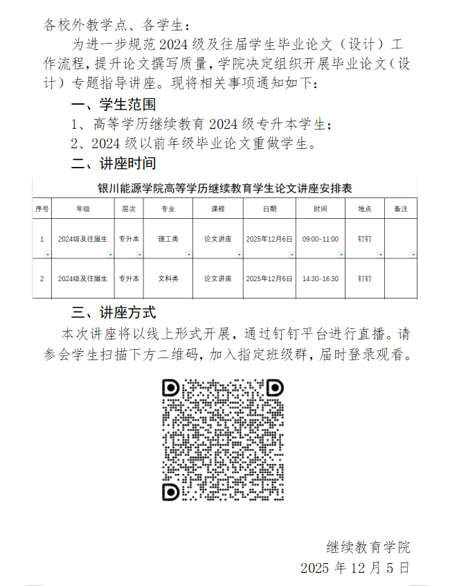 关于做好银川能源学院高等学历继续教育2024级及往届生毕业论文(设计)讲座的通知
