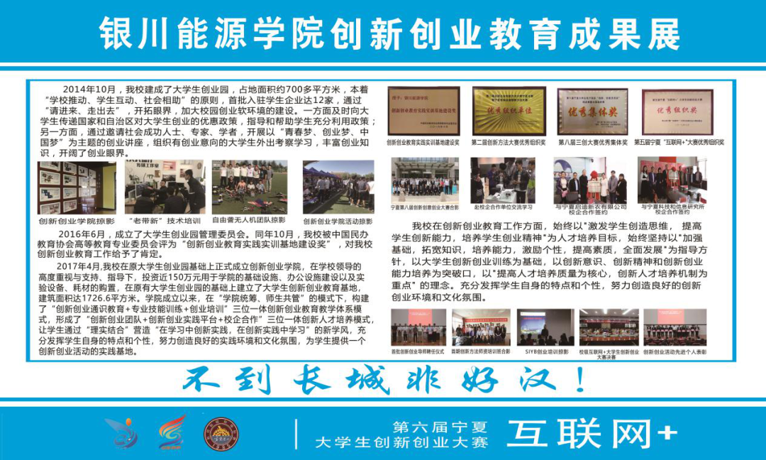 "互联网+"大学生创新创业大赛,是我国高校创新创业竞赛中规格最高、覆盖面最广、参赛人数最多、影响力最大的比赛。第六届宁夏"互联网+"大学生创新创业大赛,为更多具有创新创业热情的大学生搭建起项目与社会资源对接的平台,借助大赛平台,我校也将在以培养创新创业人才上而不懈努力。