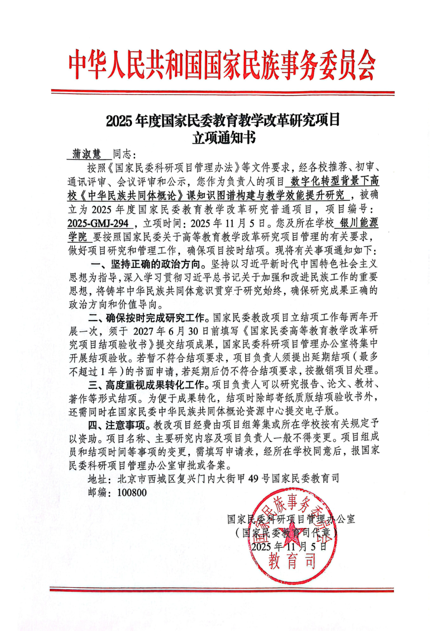 2025年度国家民委教育教学改革研究项目立项通知书