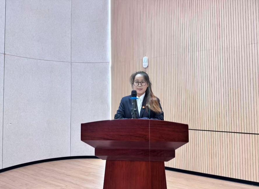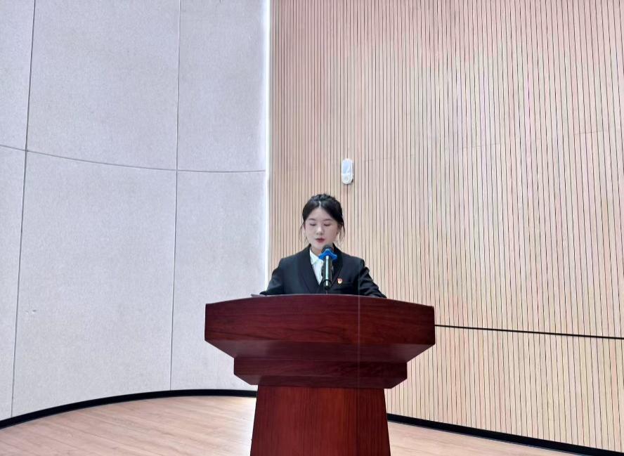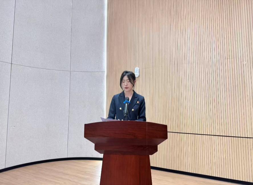 第九届分团委第一学生副书记戴婷上台做工作总结。她从多维度回顾工作,肯定成果、指出不足,并对第十届学生干部寄予殷切期望,希望新一届团队能接续奋斗、再创佳绩。