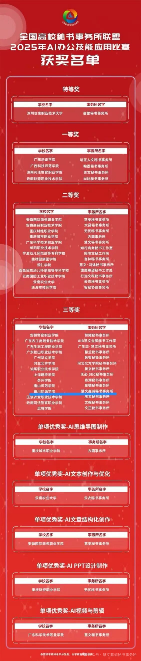 近日,在“全国高校秘书事务所联盟2025年AI办公技能应用比赛”中,文法学院慧文鑫诚秘书事务所表现亮眼,凭借扎实的综合能力从众多参赛队伍中脱颖而出,斩获全国三等奖。