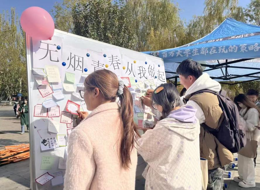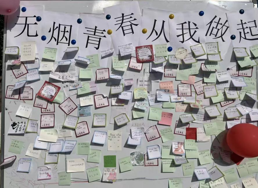 活动核心环节中,同学们纷纷在便签纸上写下自己的禁烟名言。“熄灭香烟,点亮青春”“无烟校园,呼吸更甜”“拒绝烟草,为健康续航”等一句句简洁有力的话语,被大家亲手贴在主题展板上,很快汇成一片蓝色的“禁烟宣言墙”。不少同学还现场分享身边的禁烟小故事,呼吁身边人远离烟草,让文明禁烟的理念在交流中进一步传递。