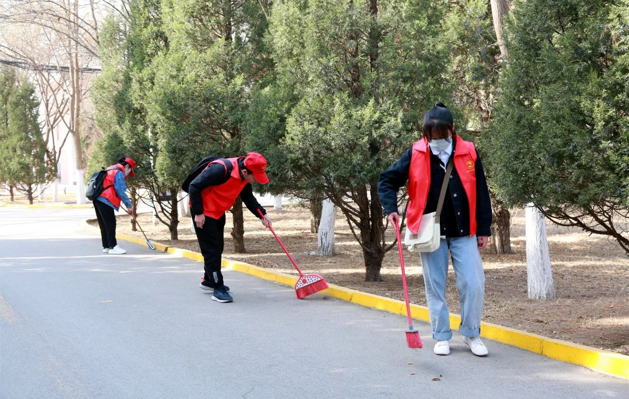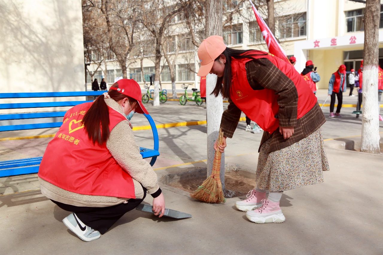 师生志愿者代表在校园里分区域展开了"学雷锋"劳动教育志愿服务活动,大家卷起袖口,拎起水桶,拿起扫帚、小铲刀,清除"牛皮癣"、残枝腐叶等校园垃圾,志愿者挥洒着青春的汗水,展露着最美的笑容,筑成了校园一道最靓丽的风景线。整个活动井然有序,使整个校园环境"焕然一新"。