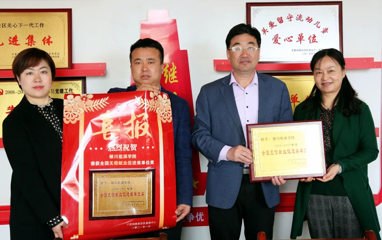 近日,国家卫生健康委员会、中国红十字会总会、中央军委后勤保障部卫生局联合颁发《关于表彰2018-2019年度全国无偿献血表彰奖励获得者的决定》,银川能源学院荣获"全国无偿献血促进奖单位奖",此次是我校第二次获此殊荣。