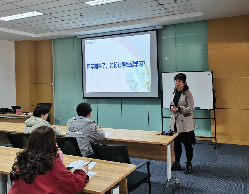 马老师从 "新学期来了,如何让学生爱学习?"引发在座教师的思考从而展开讲座内容。首先,马老师从心理学的角度出发,结合自己从事十余年高校教师的丰富经验,分析学生学习心理状况,总结让学生乐于学习的三个诀窍。其次,马老师围绕对分课堂的概念、学生接受、学习运用三个方面,着重阐述了对分课堂作为一种新型教学模式,既得到了一线教师的肯定,也受到了学生的喜爱。她建议在座教师在日常课堂教学中试用此教学模式,也可将其作为教改项目,积极申报。马老师在讲座中,旁征博引,通过不同的案例,引导在座教师与时俱进,积极进行课堂改革尝试,不断探索教学新模式,进而促进教学质量不断提升。