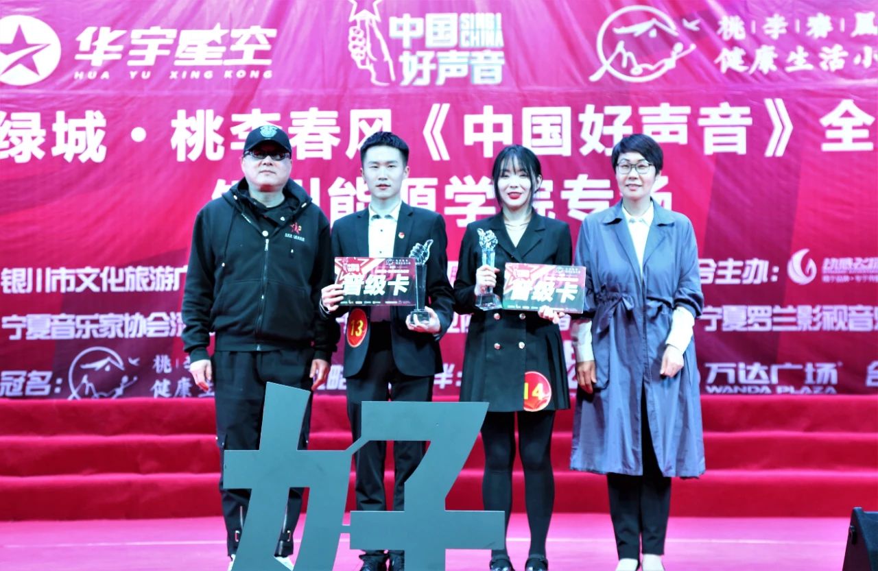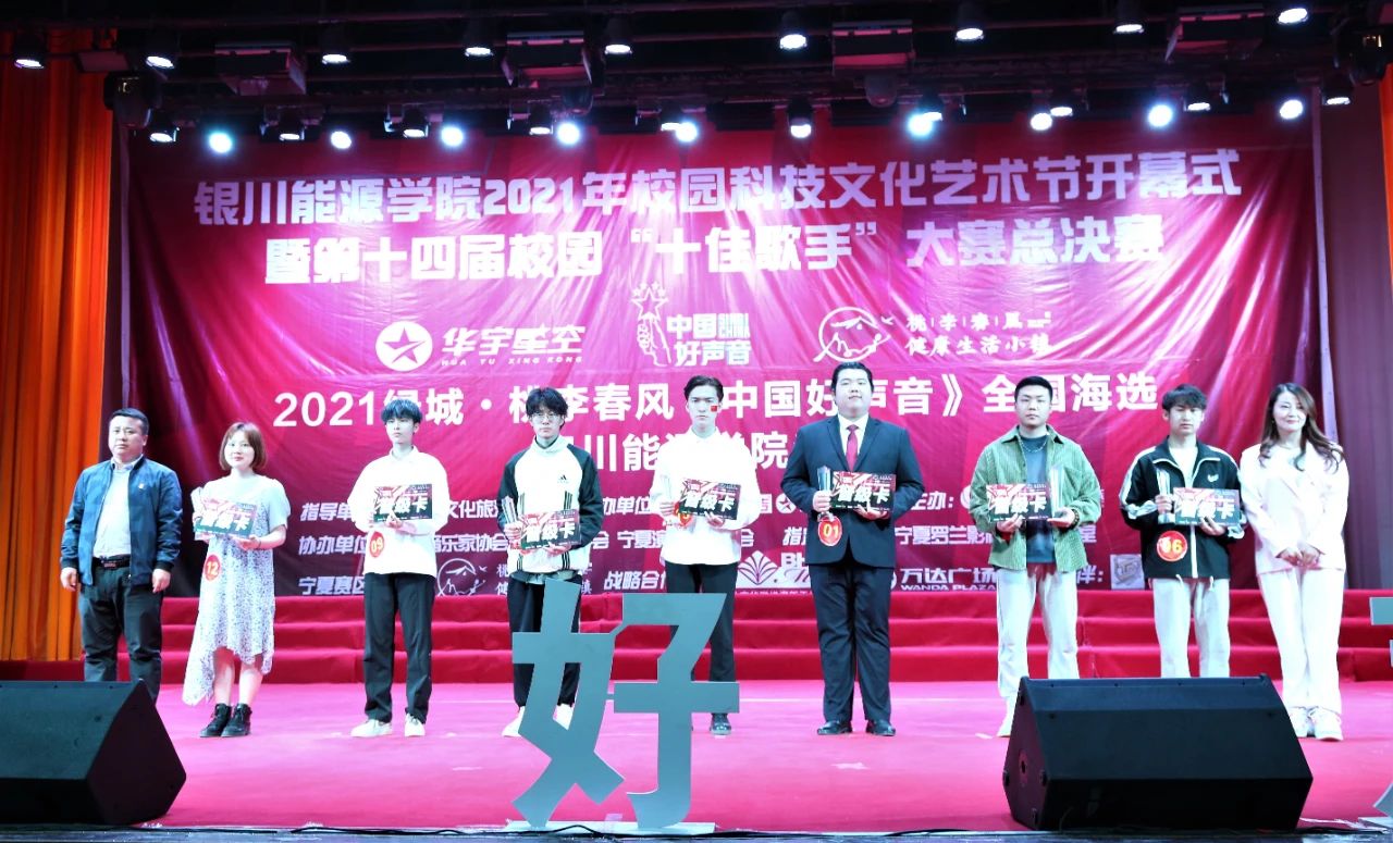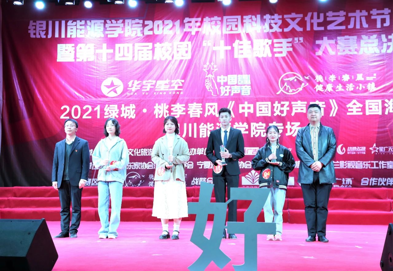 最终,商学院马瑜泽摘得桂冠;商学院李书文、电力学院张逸飞分获亚军、季军;电力学院王欢、幼师学院张昱龙、机械与汽车工程学院项晖、信息传媒学院梁庆华、外国语学院杨嘉欣、信息传媒学院马文瑞获得校园"十佳歌手"荣誉称号并代表我校参加中国好声音宁夏赛区角逐。外国语学院李雪、幼师学院宋佳悦获得"最具潜力奖",土木建筑学院任斌、幼师学院杨阿干获得优秀奖。