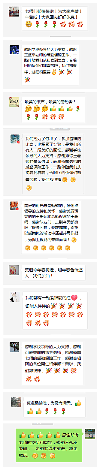 激越雄浑的时代之歌阵阵回响。赛后,合唱队员们回顾了从初赛到复赛一路走来的训练历程,感慨万千、收获满满,队员们用微信传递出了作为银能人高度的责任感和集体荣誉感,表达了广大教职工永远跟党走的理想和信念,展现了银能教师践行初心、担当使命、砥砺前行的美好姿态。我们相信,有这样一批敬业爱校的教职工队伍,银川能源学院一定会发展的越来越好。