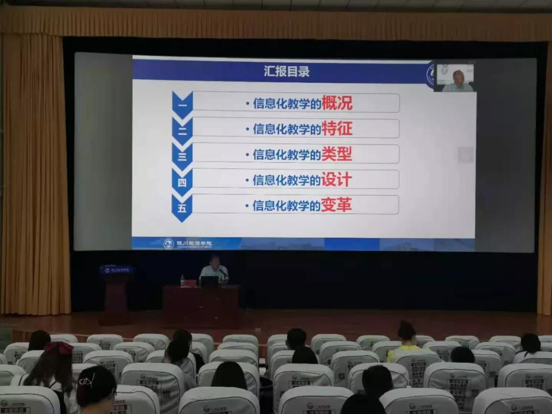 信息传媒学院院长李杰副教授以《"互联网+教育"时代背景下的课堂信息化教学改革之路》为题进行了报告。李杰从信息化教学的概况、信息化教学的特征、信息化教学的类型、信息化教学的设计、信息化教学的变革等五个方面为新教师介绍了"互联网+教育"时代背景下的课堂信息化教学方法和手段。他结合自身课堂教学的经验和体会,运用信息化手段与在场教师互动频繁,现场展示了信息化教学的魅力。