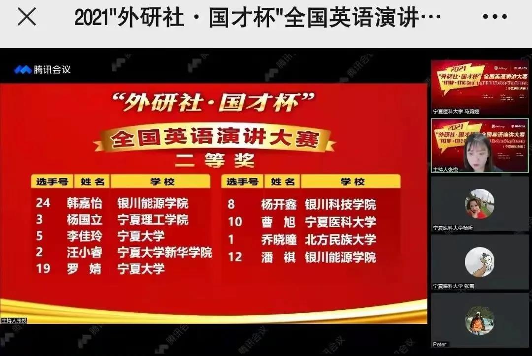 11月6日,由外语教学与研究出版社、教育部高等学校大学外语教学指导委员会、教育部高等学校英语专业教学指导分委员会、中国外语教育研究中心联合举办,宁夏医科大学承办的2021"外研社?国才杯"全国英语演讲、写作、阅读大赛(宁夏赛区)在线上顺利举行。我校选手与宁夏大学、北方民族大学、宁夏医科大学等八所高校的学生同台竞技,经过激烈角逐,我校的8名参赛选手分获二、三等奖。