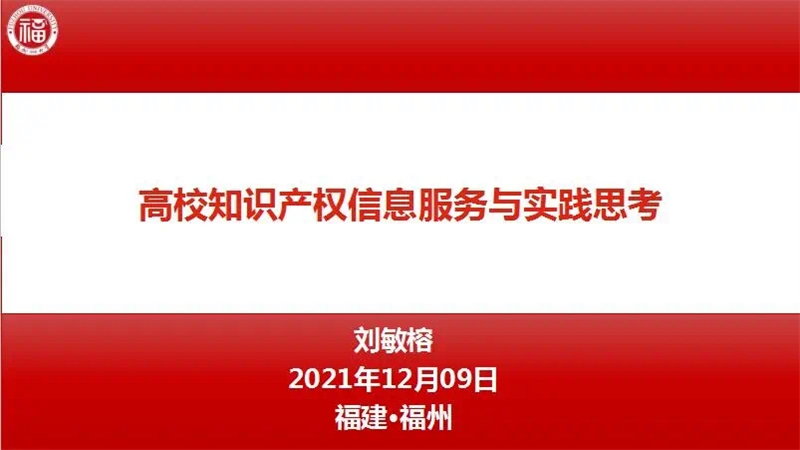为了深入贯彻习近平总书记关于深化东西协作战略的重要指示精神,深化闽宁"山海协作",丰富合作内涵,推进东西部协作走深走实;具体落实知识产权强国精神,进一步提升高校图书馆人员运用知识产权信息服务学校学科建设、科研创新和科技成果转移转化的专业技能。2021年12月9-10日在福州大学图书馆顺利召开了"2021"middot;闽宁高校知识产权信息服务培训研讨会"。此次研讨会由福建省高校图书情报工作委员会、福建省高校数字图书馆(FULink)主办,福州大学高校国家知识产权信息服务中心、宁夏大学知识产权信息服务中心承办。福建、宁夏两地38所高校图书情报机构70余名代表参会。我校图书馆负责人应邀参加了此次研讨会。