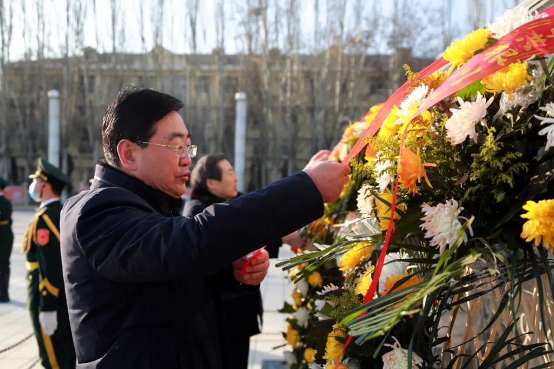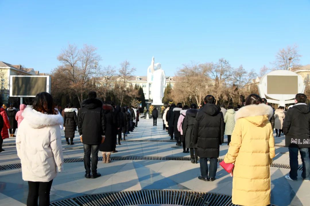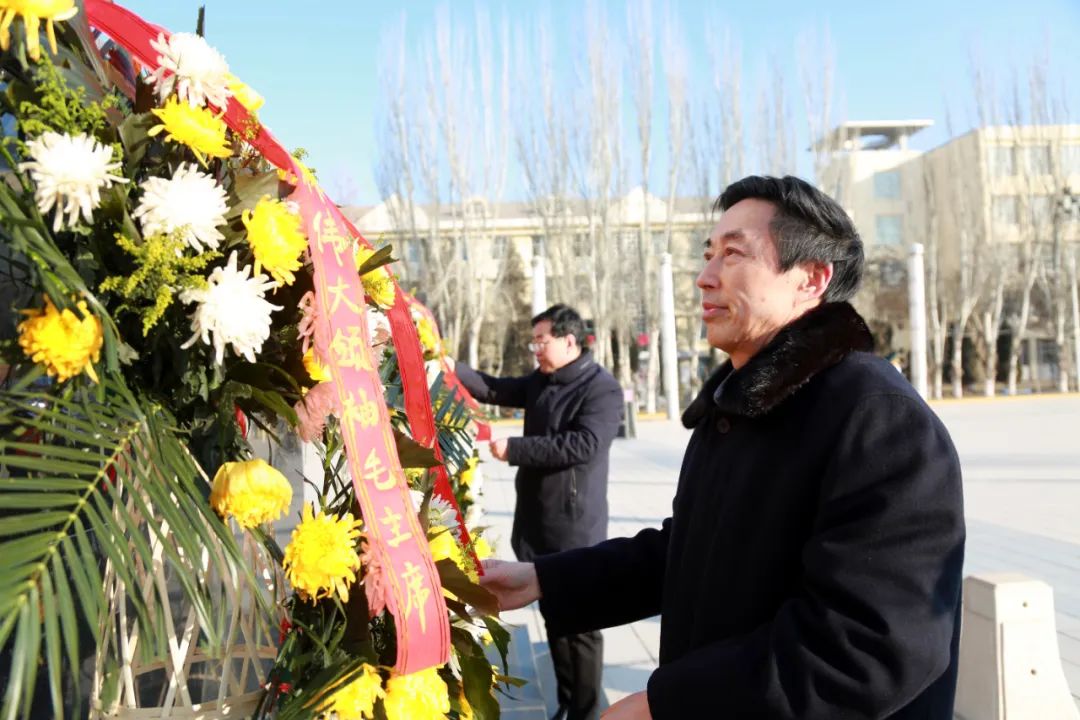 校党委书记、自治区政府督导专员赵春光,校党委副书记、执行校长孟兆怀向毛泽东主席塑像三鞠躬并整理缎带。全体师生面向毛泽东塑像三鞠躬,表达对革命先辈毛泽东同志的无尽思念和深切缅怀。