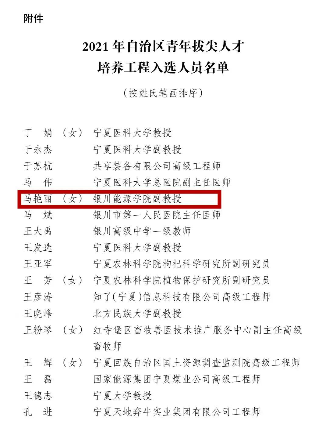 近日,自治区人力资源和社会保障厅 自治区人才工作领导小组办公室公布了2021年自治区青年拔尖人才培养工程入选人员名单,我校副校长马艳丽副教授成功入选。