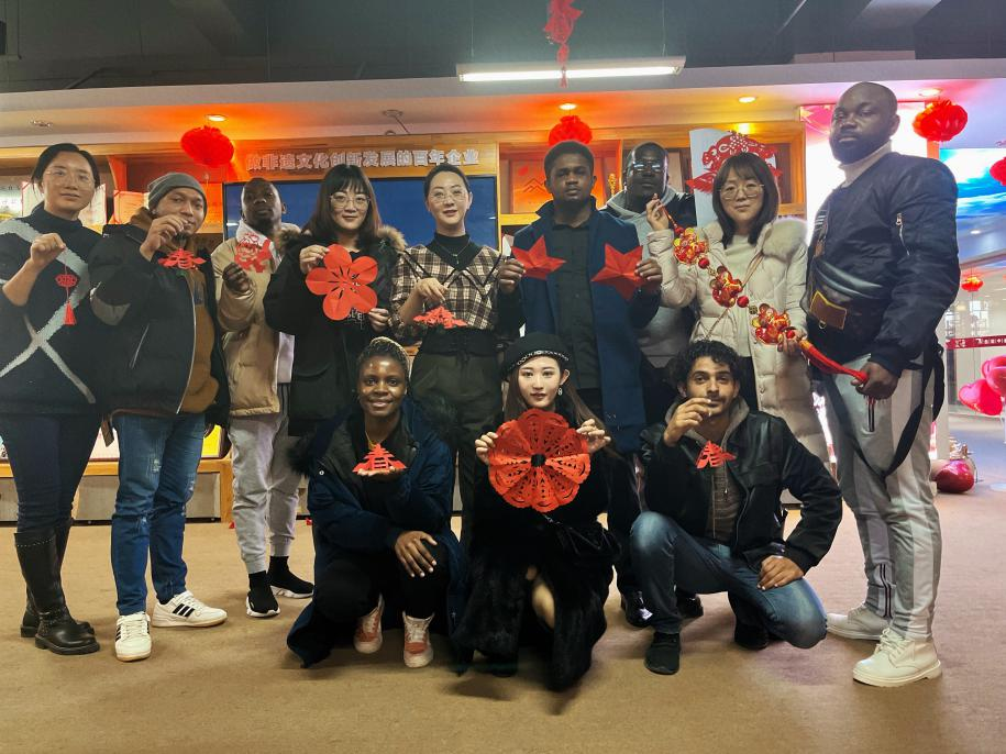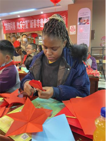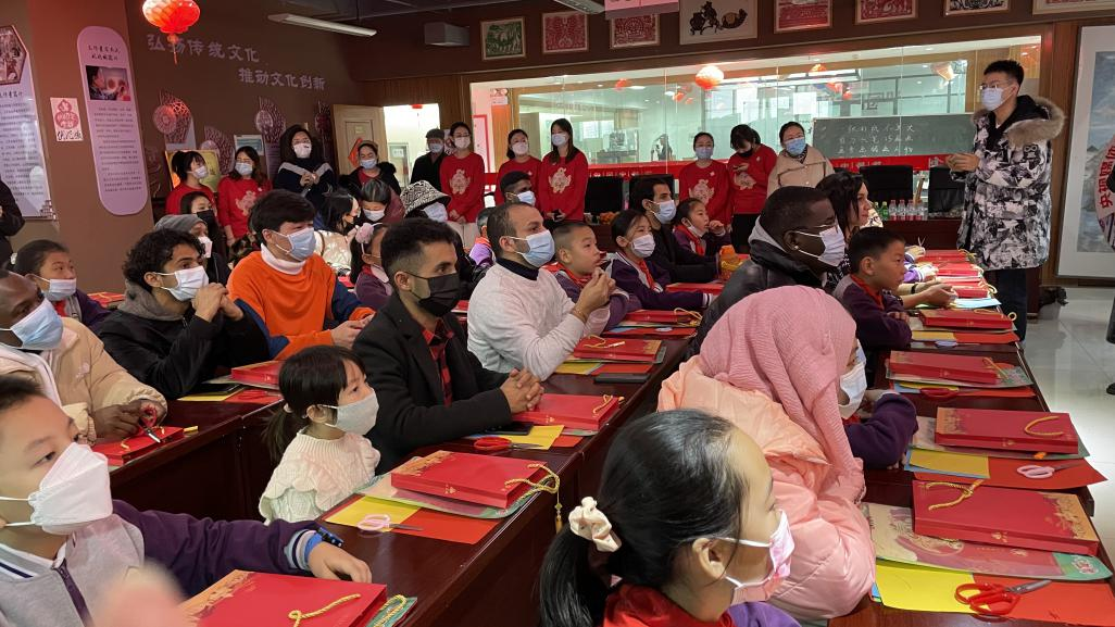 艺盟文创为留学生准备了本次非遗剪纸体验活动,留学生们参观了伏兆娥剪纸研学基地,基地负责人讲述了剪纸传承的故事,为留学生们播放了《过年》动画短片,动画人物形象均以剪纸的形象呈现,短片将国家级非遗传承人伏兆娥老师的剪纸素材,以创新手段将剪纸与二维动画相结合,展示了春节丰富多彩的文化民俗魅力。