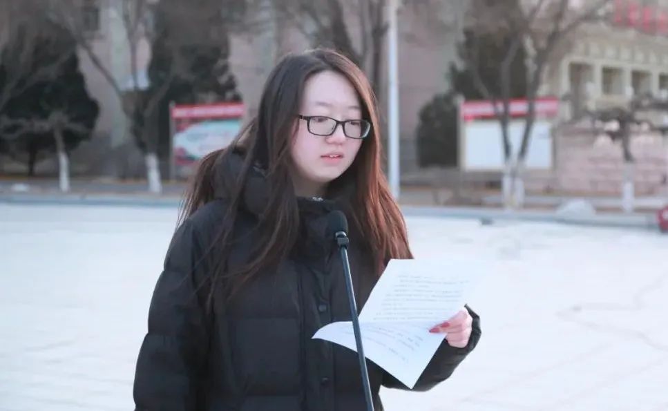 文法学院2020级秘书学专业三班蔡雯昕同学代表学生发言。蔡文昕同学作为一名冬奥城市志愿者,为冬奥赛事提供力所能及的服务,贡献自己的力量。她分享了冬奥会期间志愿服务的点点滴滴,认真履行志愿服务职责,深刻践行"奉献、友爱、互助、进步"的志愿服务精神,以朝气蓬勃的青春热情和专业的服务,向世界展示"中国温度"。她号召同学们要有"请党放心,强国有我"的自信,为祖国的建设和发展贡献青春力量。
