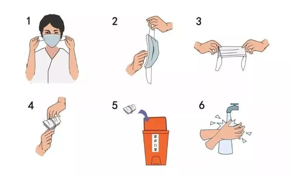 正确摘口罩的方法:通过挂绳取下,摘完口罩要洗手,没有洗手条件时最好先不摘口罩。