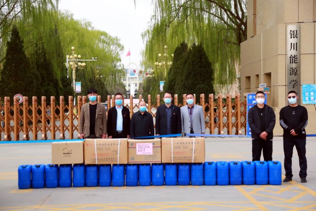 4月8日,银川能源学院化学与生物工程学院2013届化工工艺专业毕业生赵银平为银川能源学院捐赠10000个医用口罩、20桶消毒液、10套防护服、10把测温枪等防疫物资,赵银平、王跟龙创建的宁夏追风配送有限公司在学校全面开展新冠疫情防控工作的关键时刻,送上了一场"及时雨"。银川能源学院校党委委员、副校长王伟,副校长董卫国,学生工作部部长李全福,化学与生物工程学院党总支书记、院长黄瑞民,土木建筑学院党总支副书记马致远参加了此次物资捐赠仪式。