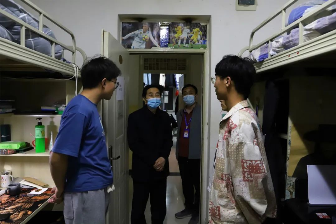 执行校长孟兆怀来到学生公寓楼,查看宿管工作和走访学生宿舍。在学生公寓楼大厅,他仔细查看了出入登记本、消毒凝胶保质期、检查了测温枪灵敏度,随后又深入宿舍与同学们亲切交流,逐一询问了同学们几号外出的;生活用品采购齐了吗?并耐心细致的回答了同学们提出的问题。鼓励同学们要适应疫情防控期间学习生活新要求,在"五四"青年节来临之际,要努力学习,发扬"五四"精神,在青春的赛道上跑出好成绩!