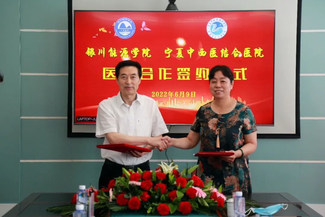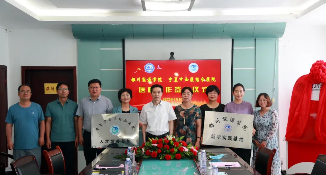 校医双方代表签订《合作协议书》,共同为"银川能源学院教学实践基地"和"宁夏中西医结合医院人才培养基地"揭牌。