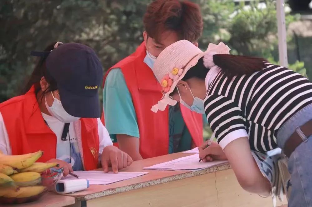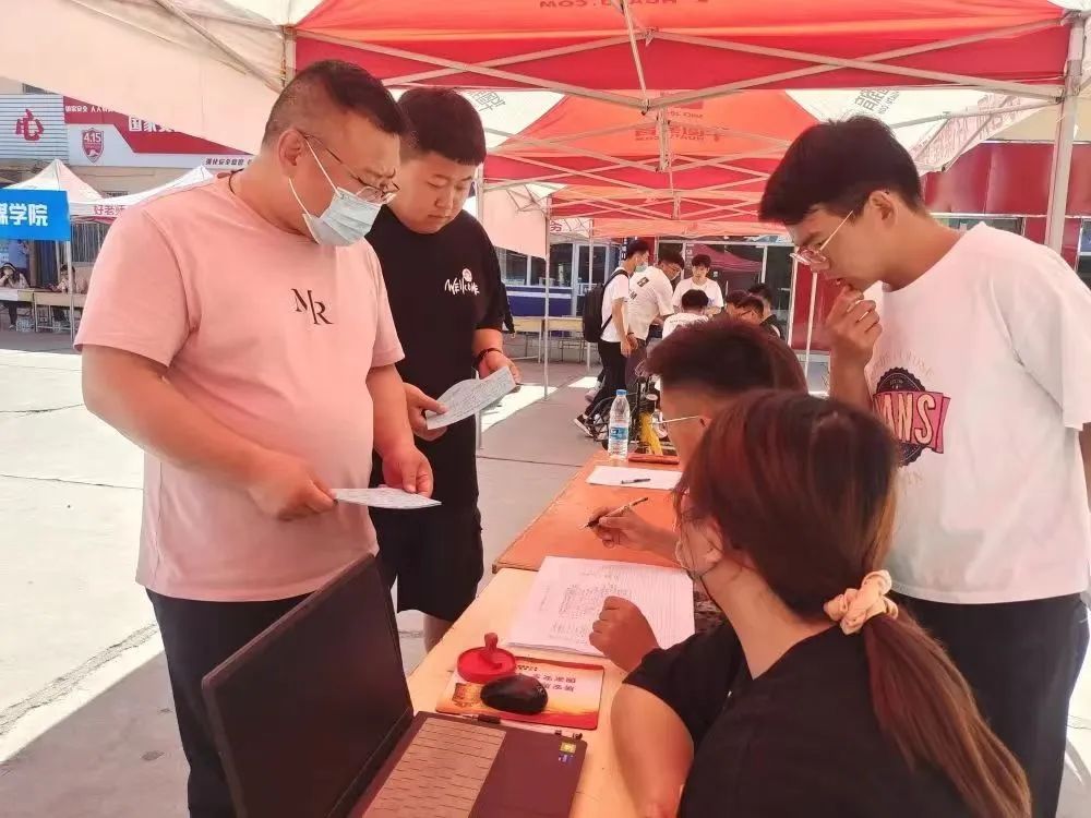 夏日炎热,校门口设置了遮阳伞棚,提供了饮水,疫情防控是新生报到的首要工作,查验核算检测报告、健康码、行程码,扫码登记、测量体温、行李消毒……全环节、全流程的细致工作,为新生及家长带来安全守护。