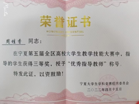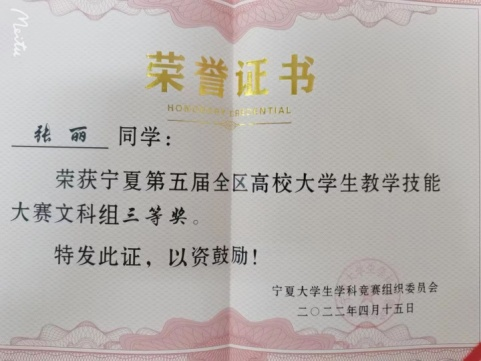 据悉,银川能源学院坚持社会主义办学方向,坚决贯彻落实党的教育方针,强化内涵建设,走高质量发展之路。学校十分重视教育教学改革,注重培养学生的创新意识,提高实践能力,将中华优秀传统文化融入教育教学工作,"为党育才,为国育人"。我校文法学院坚持贯彻学校内涵发展要求,促进专业发展,突出实践教学,强化文化育人举措,努力提高人才培养质量,在今年学生技能比赛中屡获佳绩。在全区第五届高校大学生教学技能大赛中,文法学院教师周桂香指导的学生张丽获得文科组三等奖,周桂香获得"优秀指导教师"称号。在全区职业技能大赛"文秘速录"比赛中,文法学院教师穆树红和彭彦指导的3支参赛队喜获2项团体三等奖。