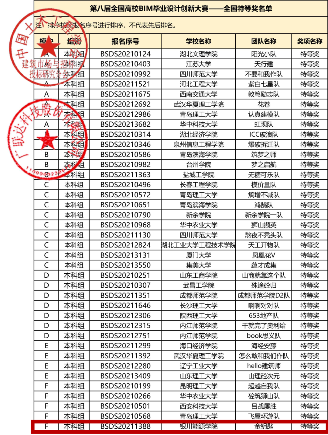 6月26日,由中国高等教育学会指导,中国土木工程学会、广联达科技股份有限公司主办的"第八届全国高校BIM毕业设计创新大赛"全国总决赛圆满落幕。银川能源学院土木建筑学院与校企合作单位"宁夏第二建筑有限公司"共同指导的"金钥匙"代表队获得全国特等奖的优异成绩。
