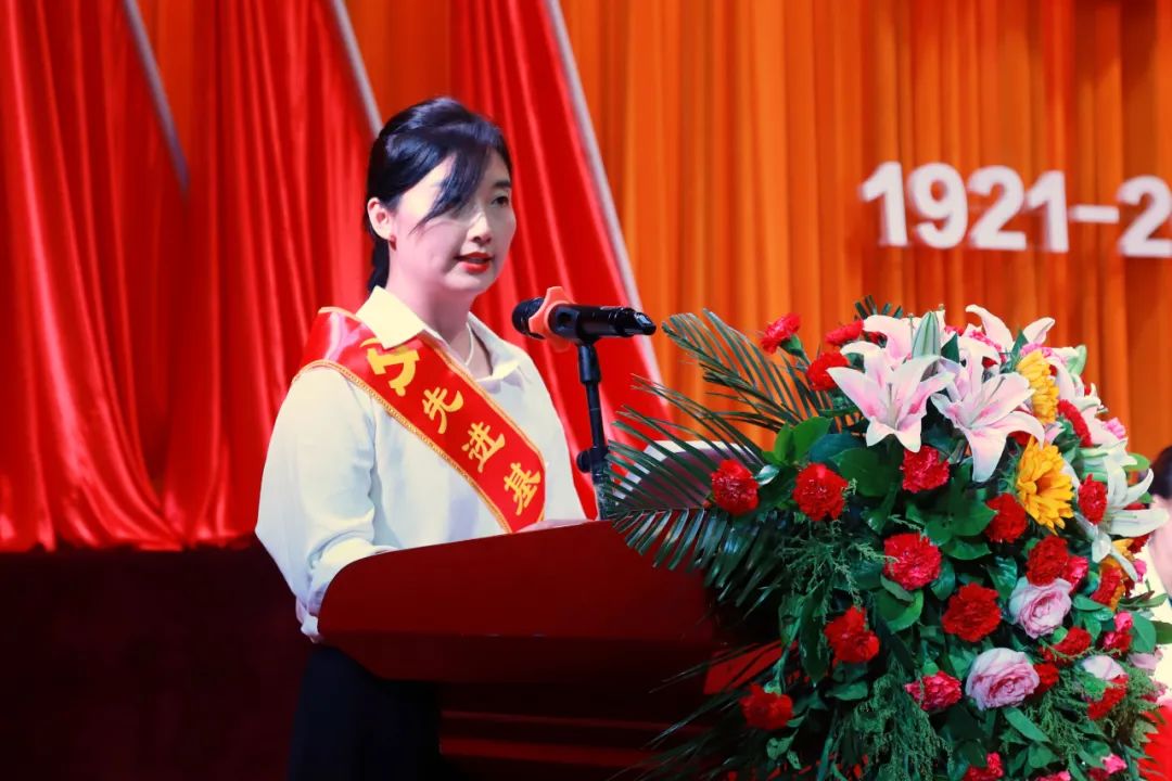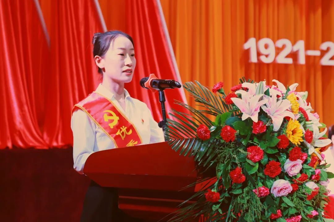 商学院学生第一党支部书记李佳玲代表优秀党务工作者进行了交流发言,谈了自己的工作感悟:"作为新时代青年教师,基层党务工作者,我们生逢其时,也重任在肩,面对百年之未有大变局,我一定牢记习近平总书记殷切嘱托,勇于担当、敢于拼搏,不忘初心、牢记使命,立德树人、守正开新,引领青年学子在奋斗中释放青春激情、追逐青春梦想。"