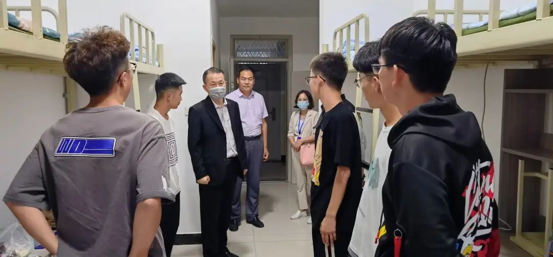 新生入学第一天,理事长吴玉聪、副校长董卫国带领就业处、学生处、资产与后勤管理处、商管处等负责人前往新生宿舍看望了新同学。