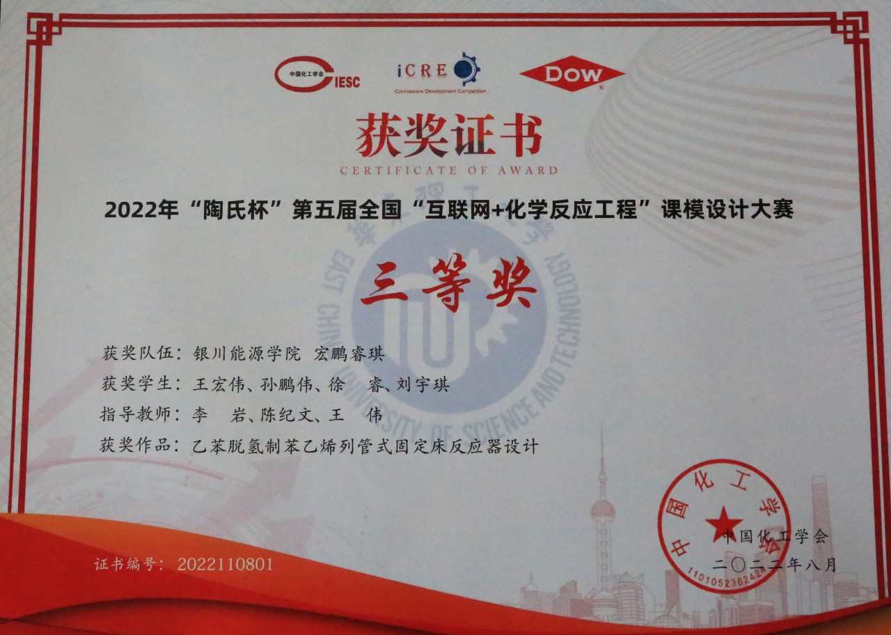 本次大赛吸引了来自大连理工大学、华东理工大学、四川大学、中国石油大学、中南大学等高校同台竞技,共计385支队伍报名参加。银川能源学院的参赛队伍——宏鹏睿琪",由化学与生物工程学院本科生王宏伟、孙鹏伟、刘宇琪和徐睿组成,参赛选题为"乙苯脱氢制苯乙烯列管式固定床反应器设计"。队伍通过初审、决赛的重重考验,以及专家工程师对作品性能和准确度的技术评分,最终取得全国三等奖的成绩。