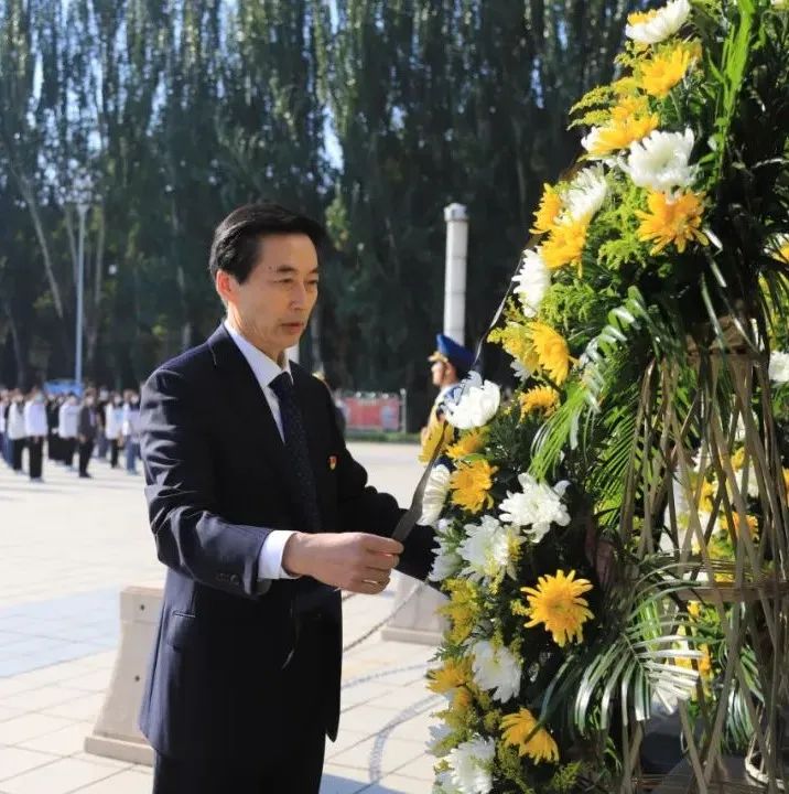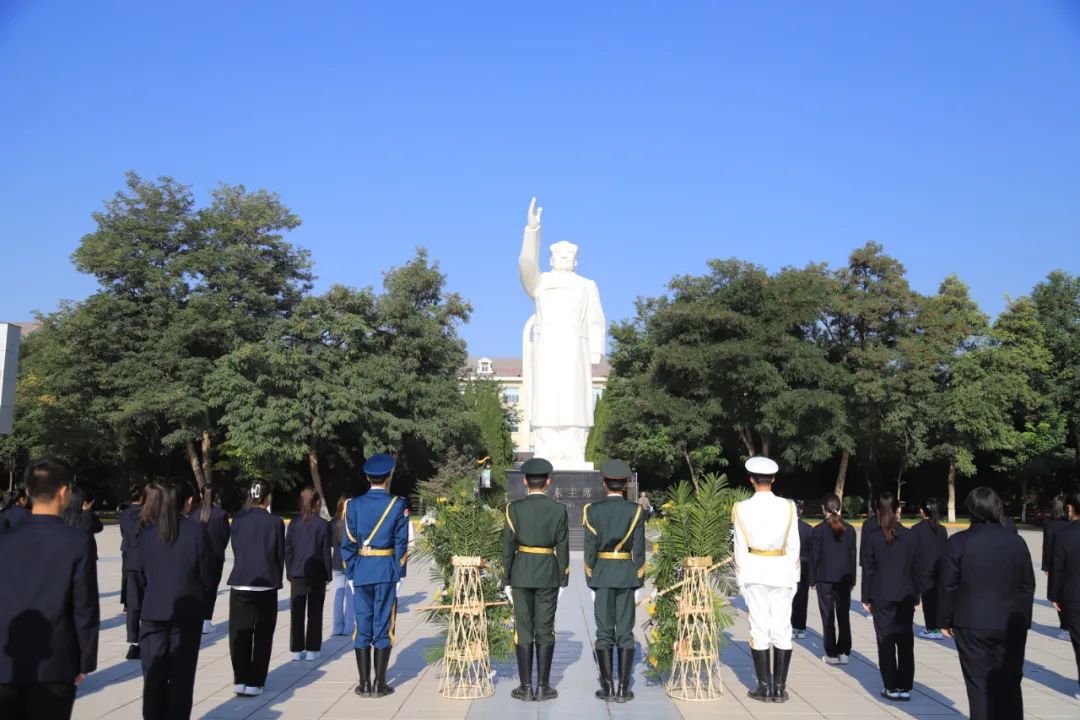 学校理事会理事长吴玉聪,党委副书记、执行校长孟兆怀向毛泽东塑像三鞠躬并整理缎带;全场肃立,师生向毛泽东塑像三鞠躬,表达对革命先辈的无尽思念和深切缅怀。