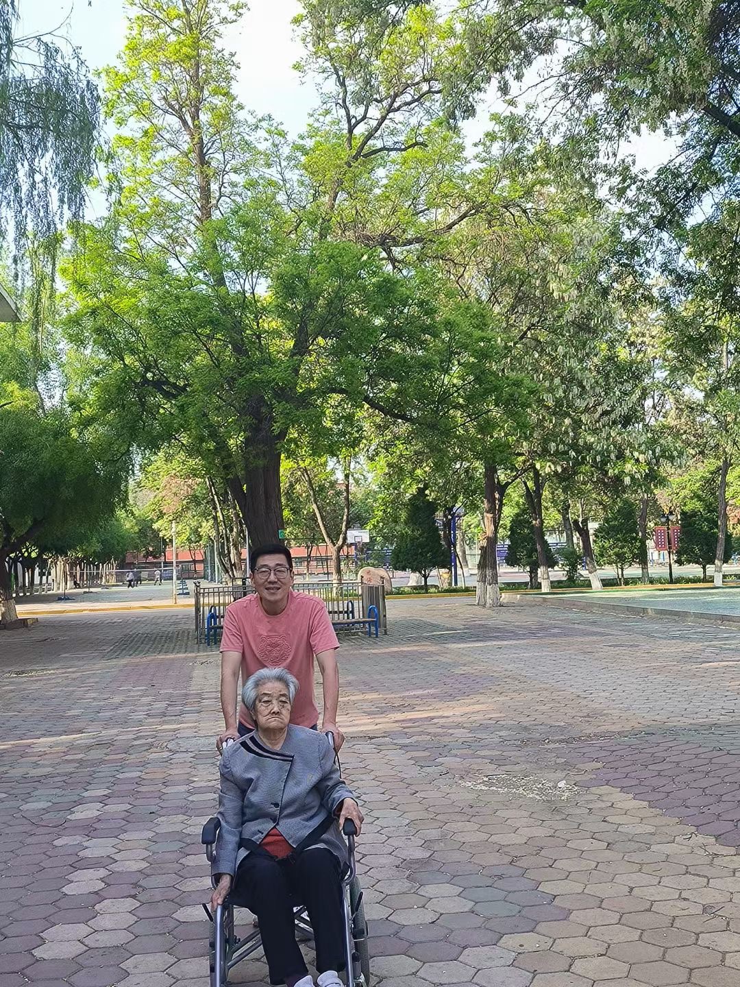 赵桂生推着母亲在校园中散步。图片由赵桂生提供
