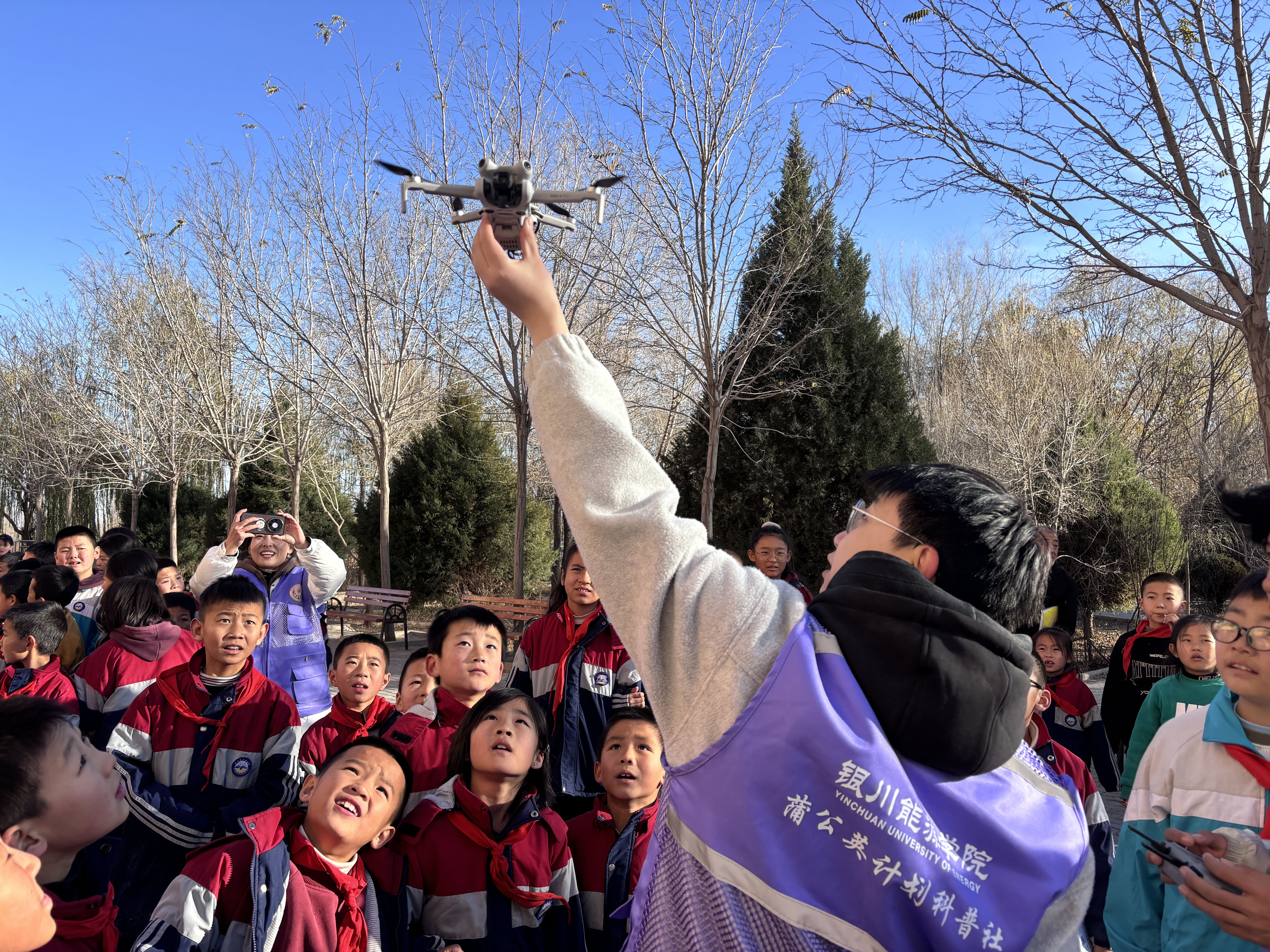 为深化科普资源共建共享,铸牢中华民族共同体意识,2025年11月17日,以“共筑科技梦,同绘团结景”为主题的宁夏全国科普教育基地联盟联合活动在永宁县闽宁镇第一小学成功举办。银川能源学院受邀参加活动,此次活动由科研与学科建设处牵头,选派信息传媒学院无人机教学团队及蒲公英计划科普社团共10名师生骨干,为当地青少年带去了一场沉浸式的无人机科普盛宴。