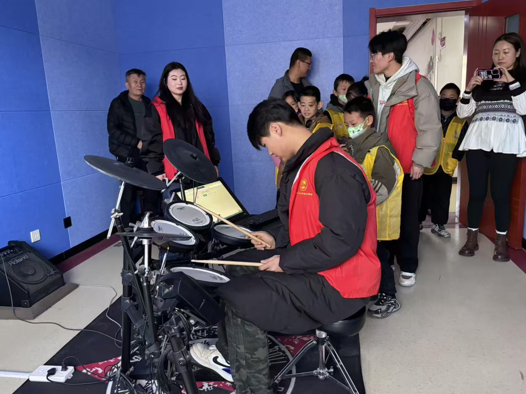 活动当天,志愿者们早早抵达集合点,协助工作人员完成签到、秩序维护等前期准备工作,用细致周到的服务为活动保驾护航。在贺兰县文化馆,志愿者们化身“文化引导员”,带领孩子们参观本土非遗精品展区,耐心讲解展品背后的历史故事与文化内涵,引导孩子们感受传统手工艺的匠心与韵味。在电子鼓体验区,志愿者们主动协助孩子们调试设备,鼓励他们大胆尝试,看着孩子们随着鼓点尽情敲击,感受传统音乐与现代科技的奇妙碰撞,志愿者们脸上也洋溢着欣慰的笑容。