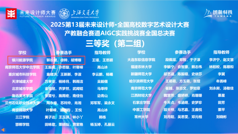 近日,第十三届未来设计师全国高校数字艺术设计大赛(NCDA)AIGC实践挑战赛全国总决赛在上海交通大学圆满落幕。银川能源学院信息传媒学院郭长健、徐帅、胡博塬三位同学组成的团队,凭借扎实的技术功底与创新设计,从全国千余支队伍中脱颖而出,斩获国家三等奖。 作为入选《全国普通高校学科竞赛排行榜》的高水...