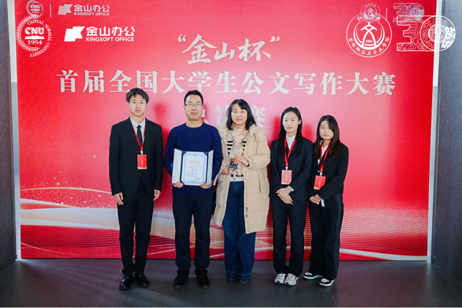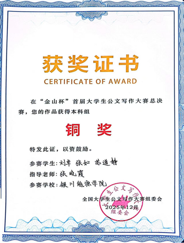 12月6日,“金山杯”首届全国大学生公文写作大赛总决赛暨颁奖典礼在首都师范大学隆重举行。由银川能源学院文法学院张晓霞老师指导的刘卓、张如、苏道静同学撰写的《数字经济背景下宁夏新消费模式权益保障研究调研报告》荣获大赛铜奖,李嘉欣组完成的《红色文化在青年群体中的传播效果》调研报告,入围大学生百篇优秀调研报告。