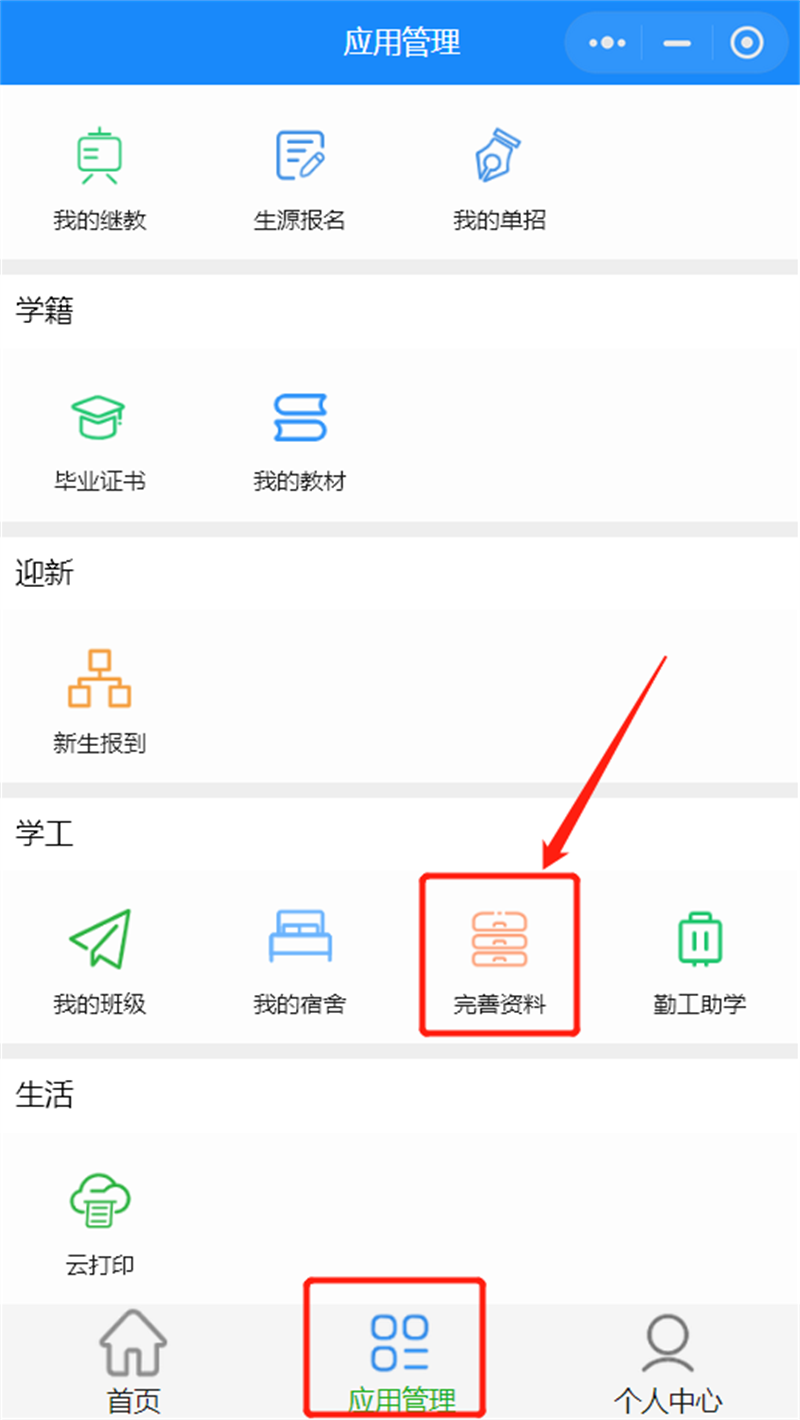 第三步:选择应用管理,点击完善资料,确保提供有效的联系方式