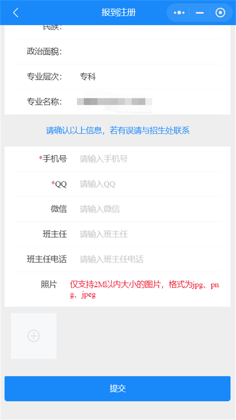 点击【新生报到】,填写有效的【手机号、QQ、微信等信息】,点击【提交】