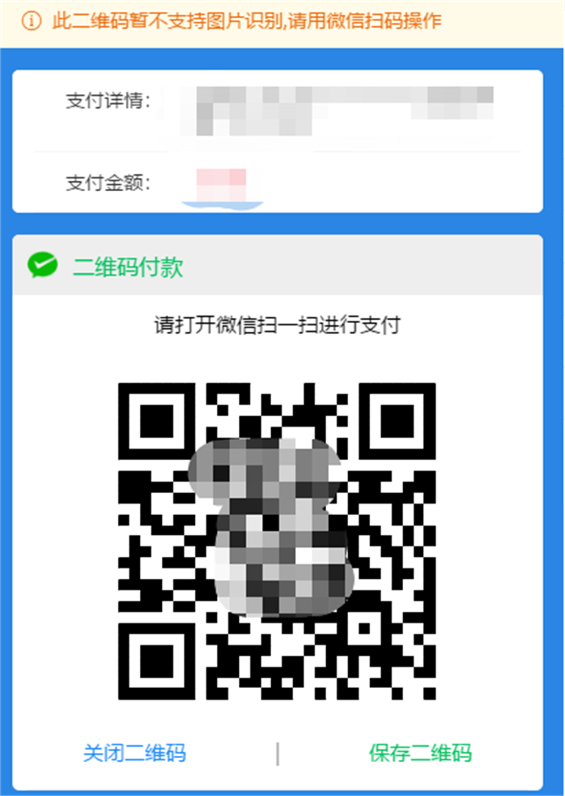 注意:支付前,请仔细检查收款方是否是自己所属学院,收款金额是否正确(若有误请联系学校)。