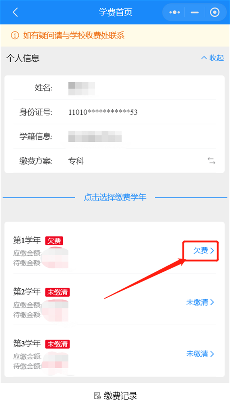 核对缴费信息是否正确(若有误请联系学校)。点击具体缴费学年的【欠费】或【未缴清】,然后点击【立即支付】按钮