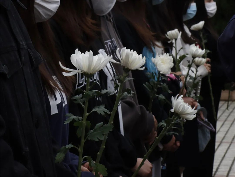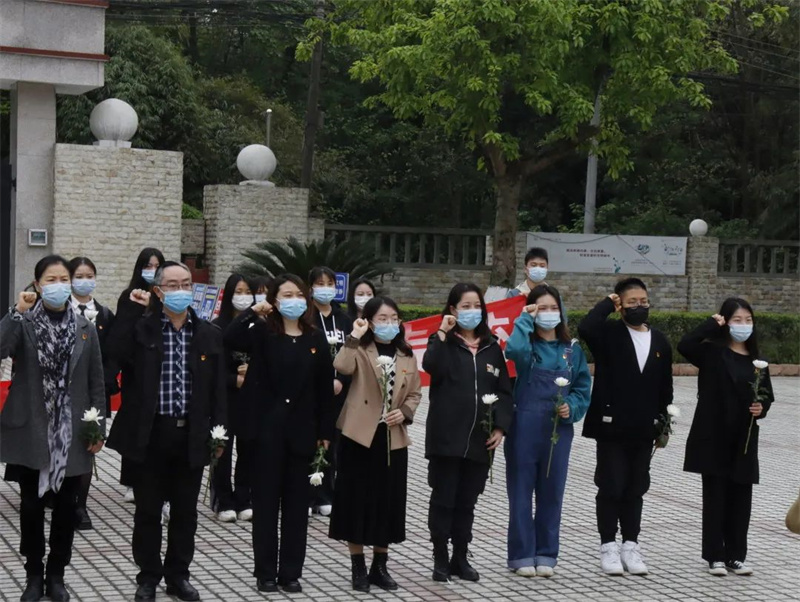 学生代表向烈士敬献花圈,用寄托着浓浓哀思和敬意的花圈向逝去的英雄致敬。随后,全体肃立向烈士默哀,告慰先辈忠魂,寄托无限哀思。党员同志们面向鲜红党旗,重温入党誓词,怀托坚定信念在未来革命道路上听党话、感恩党、跟党走,以铮铮誓言缅怀英烈、抒发爱国爱党情怀。